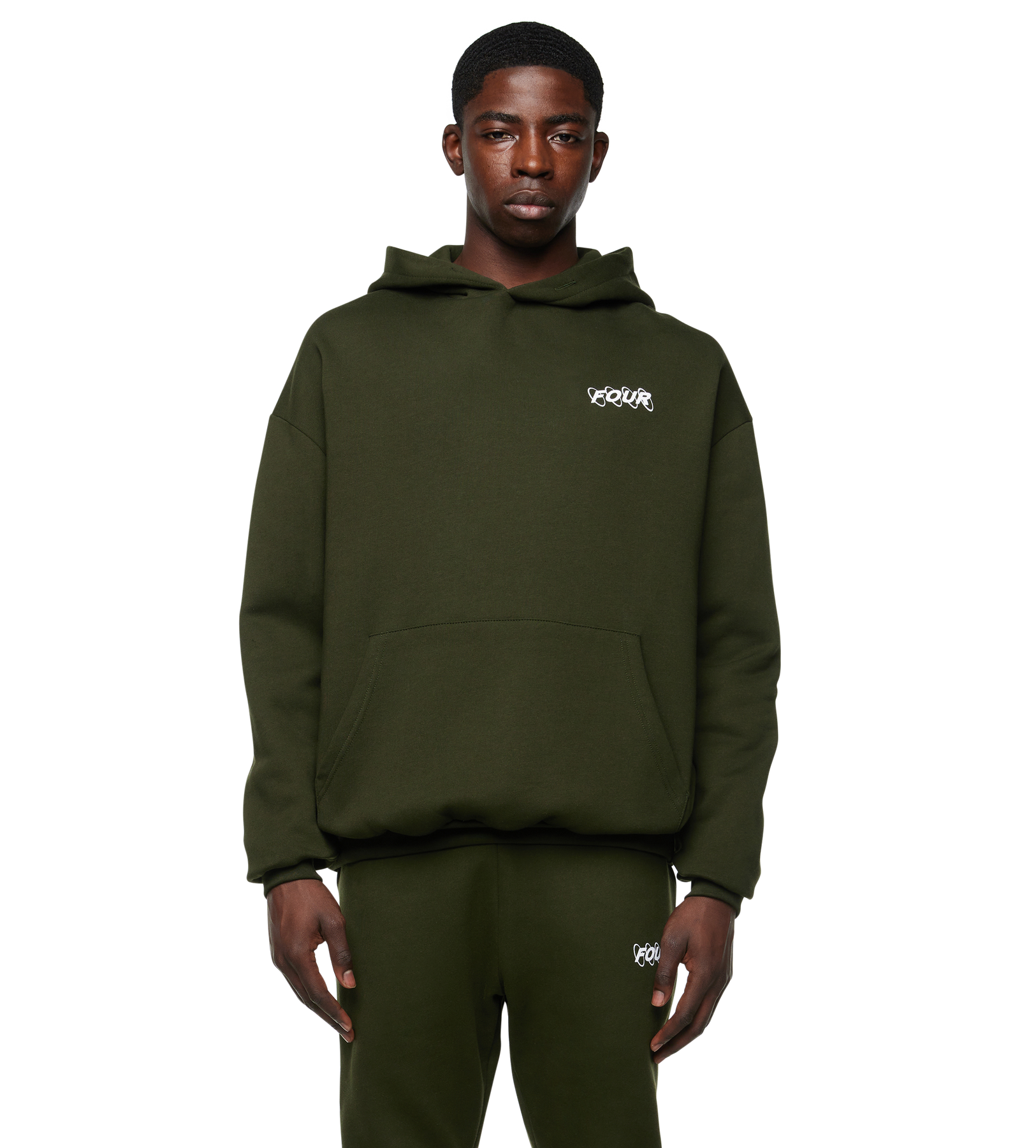 An oversized fleece hoodie designed with a clean silhouette and signature circular logo detailing. The army green tone gives the piece a grounded, contemporary look, while the small chest logo and large back artwork create a balanced graphic identity. Made from structured 330 GSM fleece for a comfortable yet elevated feel.