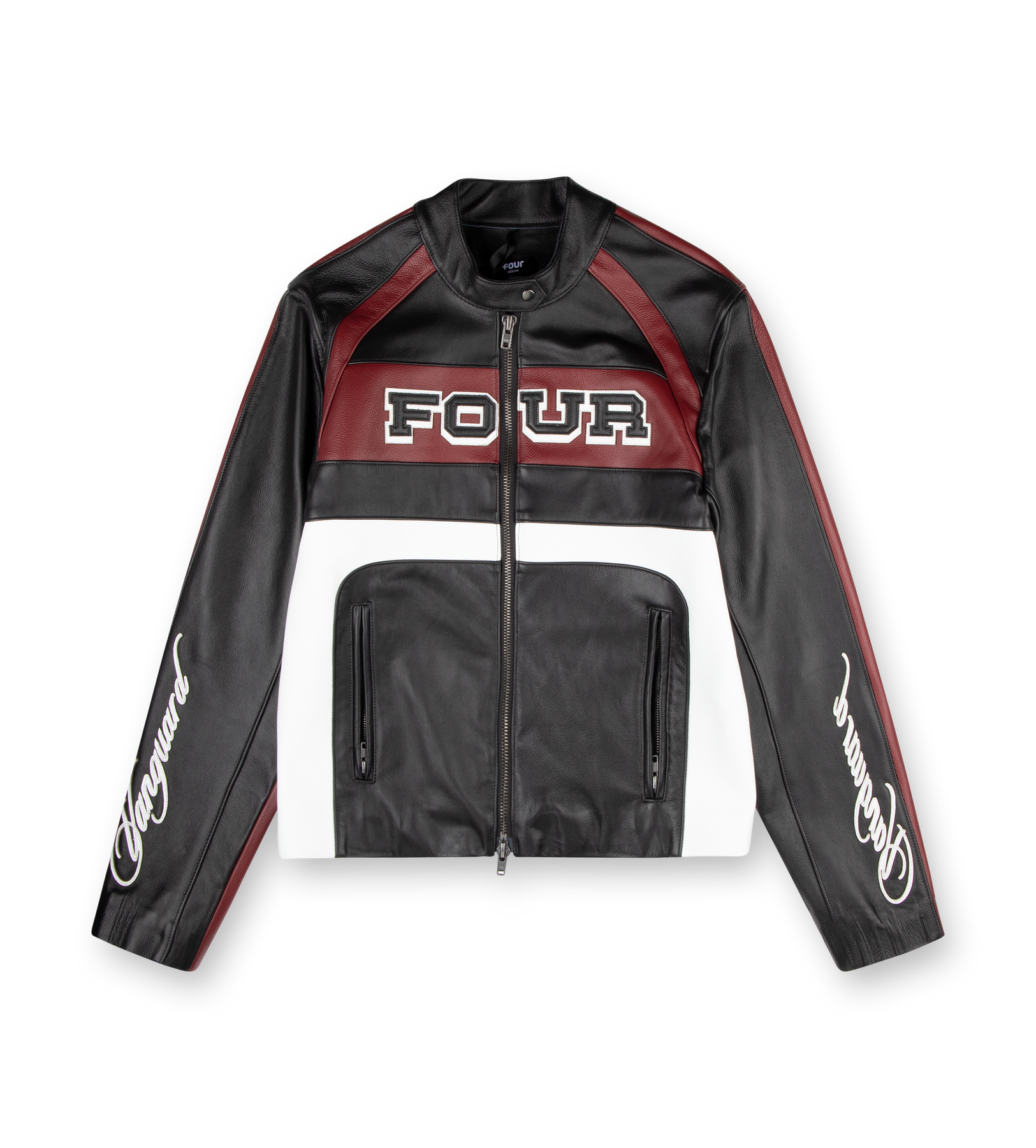 Designed with a two-way zipper and a snap-button collar, this jacket balances utility with a sharp aesthetic. Welt pockets add practicality, while embroidered and leather patches provide standout detailing that elevates its graphic identity. Finished with a branded lining, it embodies FOUR’s distinctive fusion of heritage references and contemporary streetwear design.